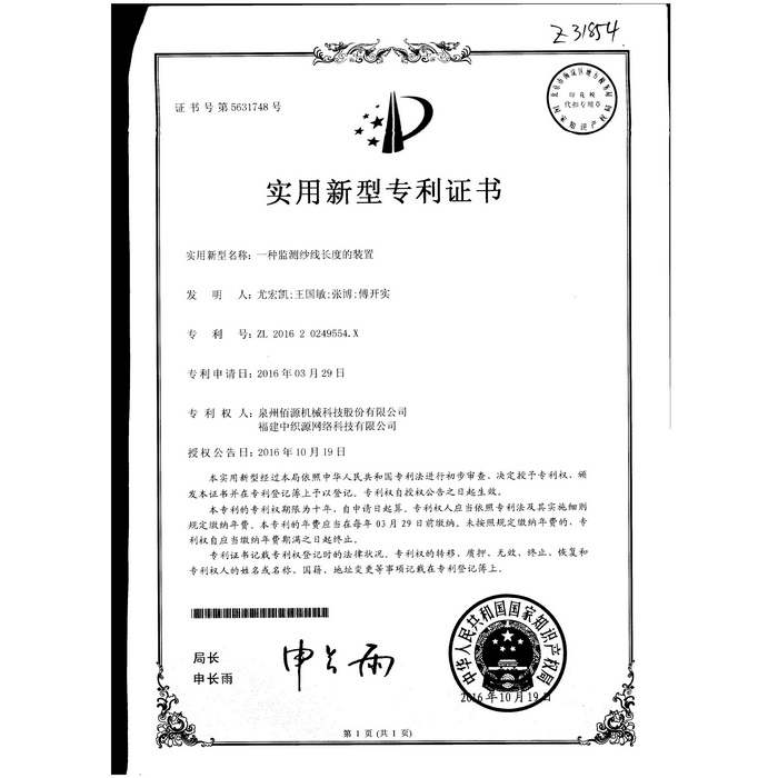 下一篇:新型-泉州佰源機械科技股份有限公司 一種大圓機大盤齒輪的脈沖微調(diào)結(jié)構(gòu) 實用新型專利證書